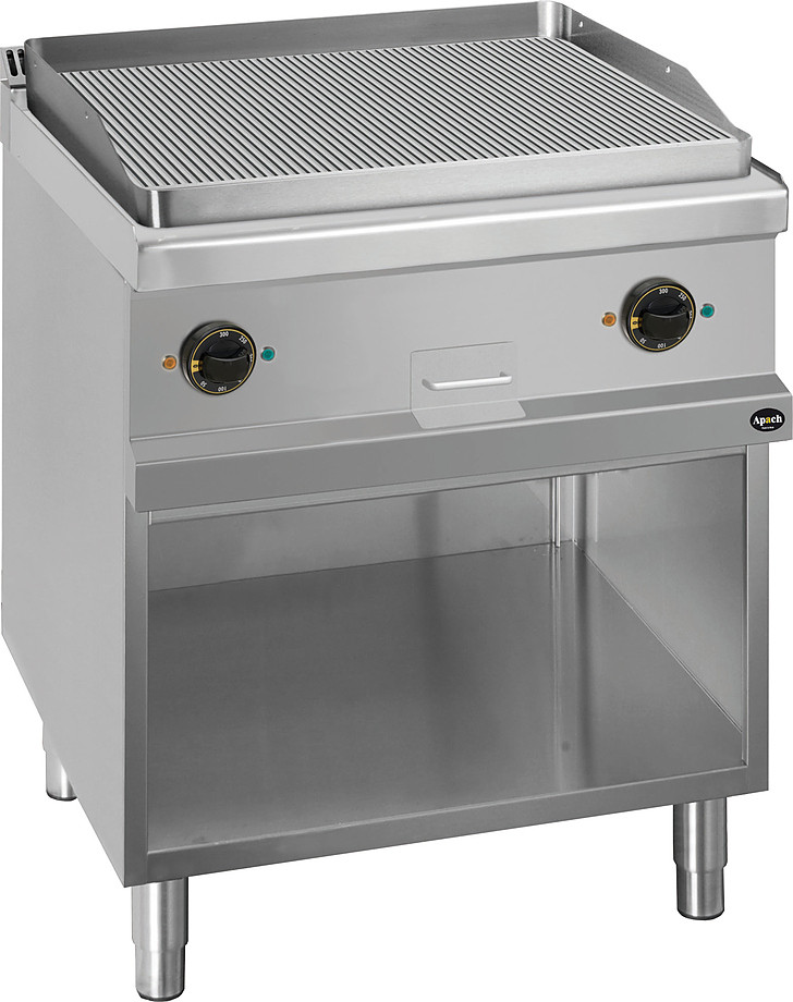 Открытая электрическая сковорода Apach APTE-77PR/PL 700-й серии предназначена для обжарки мяса, рыбы и овощей на предприятиях общественного питания и торговли. Модель с закругленными краями и бортами оснащена электромеханической панелью управления с 2 терморегуляторами и 4 световыми индикаторами, выдвижным лотком для сбора остатков пищи, масла и жира и открытой подставкой с регулируемыми по высоте ножками. Корпус, панель управления и вытяжная решетка выполнены из нержавеющей стали AISI 304, рабочая поверхность – из конструкционной стали, боковые и задняя панели - из нержавеющей стали AISI 430, лоток - из нержавеющей стали.